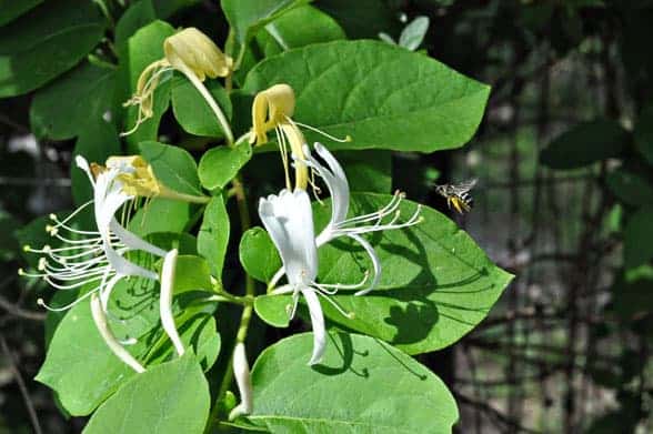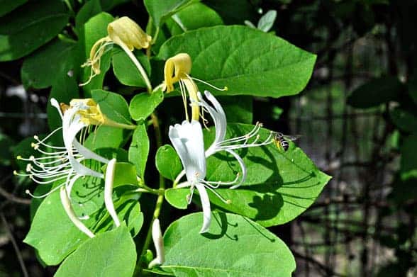 …I stepped just to the right of them to take photos of a big honeysuckle bush that has just started blooming. I don’t have a macro lens on my camera; these shots were taken with my favorite lens, an 18-55mm. While it might not be macro, it was able to get close…